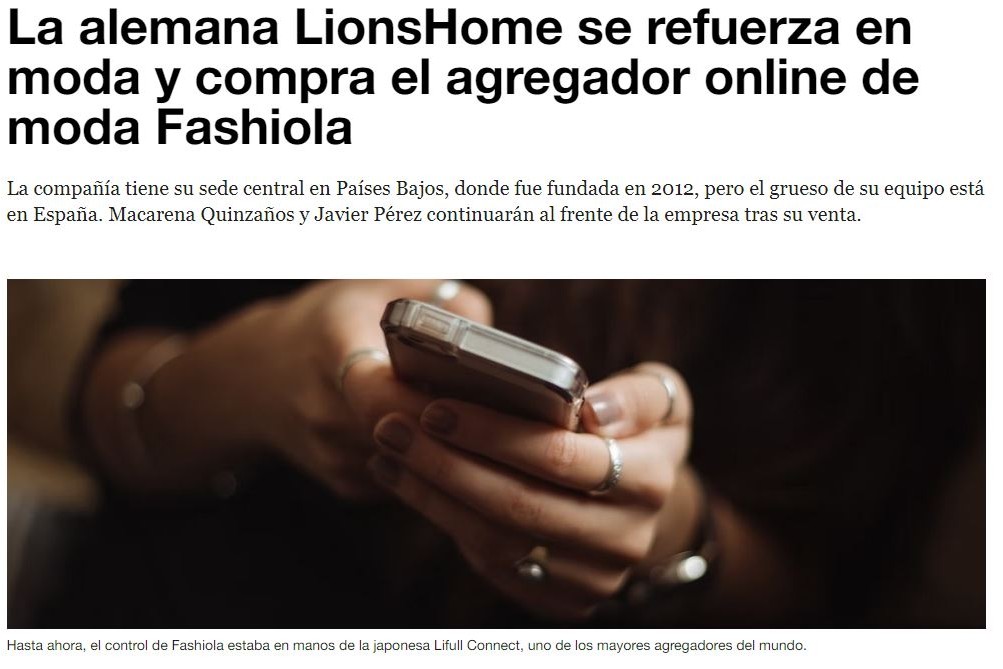 NewsCorporate Finance October 27, 2022Magnum Capital to acquire AdPone and integrate it into SunMediaRead More October 17, 2022RM Trade, Inditex’s logistics provider, opens its capital to the Oquendo fund.Read More October 10, 2022A French group controlled by Ardian buys 100% of Esbelt.Read More September 14, 2022Arkance – a subsidiary of Monnoyeur – has acquired AsidekRead More July 29, 2022Innovery acquires 100% of Open3S and strengthens its presence in SpainRead More July 28, 2022Waterland Private Equity-backed LionsHome acquires FASHIOLA.Read More July 11, 2022You are Capital closes five deals from January to June 2022.Read More July 7, 2022Inveready invest in DevonLabsRead More
