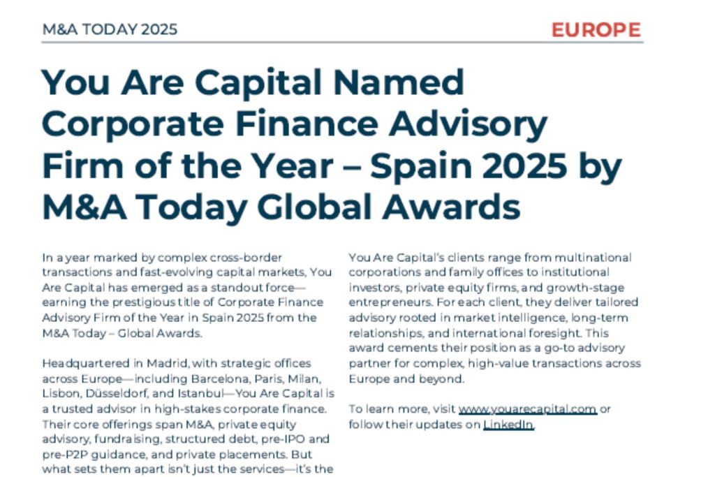 You Are Capital has been named Corporate Finance Advisory Firm of the Year in Spain 2025 by the M&A Today – Global Awards, recognizing our leadership in complex cross-border transactions and rapidly evolving capital markets. With a strong European footprint and decades of dealmaking expertise, we continue to deliver fast, discreet, and high-precision execution. Our recent advisory to European Digital Group on its majority acquisition of Garaje de Ideas highlights our growing impact in high-growth and PE-backed sectors.